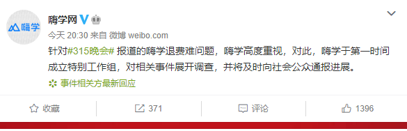 针对315晚会报道的嗨学退费难问题,嗨学高度重视,对此,嗨学于第一时间成立特别工作组,对相关事件展开调查,并将及时向社会公众通报进展。嗨学网晚间也对央视报道进行了回应,其表示,针对315晚会报道的的嗨学退费难问题,嗨学高度重视,嗨学于第一时间成立特别工作组,对相关事件展开调查,并将及时向社会公众通报进展。