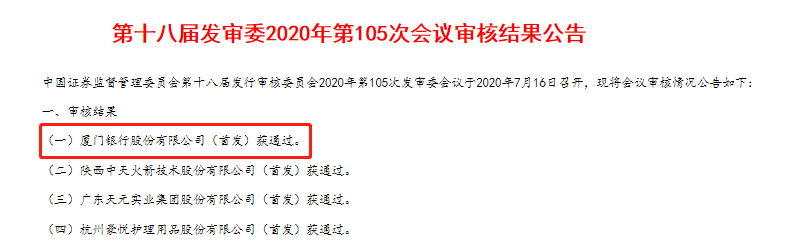 证监会官网信息显示,厦门银行已于7月16日顺利过会,即将成为第37家A股上市银行,也是今年首家A股上市银行。