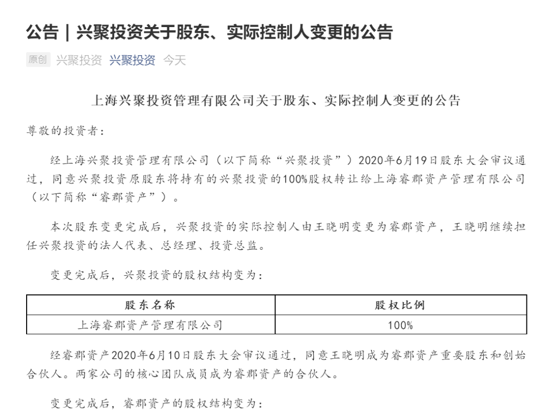 公告显示,经兴聚投资股东大会审议通过,同意兴聚投资原股东将持有的兴聚投资的100%股权转让个上海睿郡资产。变更完成后,兴聚投资的实际控制人由王晓明变更为睿郡资产,王晓明继续担任兴聚投资的法人代表、总经理、投资总监。