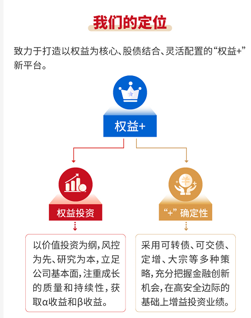 所谓“权益+”就是权益投资“+”确定性,在权益投资方面,以价值投资为纲,风控为先,立足公司基本面,获取阿尔法收益和贝塔收益。“+”确定性是采用可转债、可交债、定增、大宗等多种策略,充分把握金融创新机会,在高安全边际的基础上增益投资业绩。