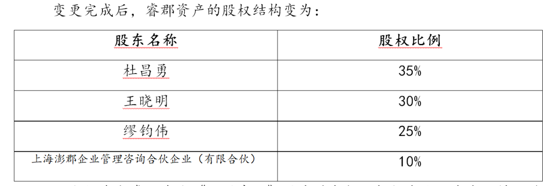 在变更完成后,睿郡资产的股权比例为杜昌勇持股35%、王晓明持股30%、缪钧伟持股25%、上海澎郡企业管理咨询合伙企业(有限公司)持股10%。