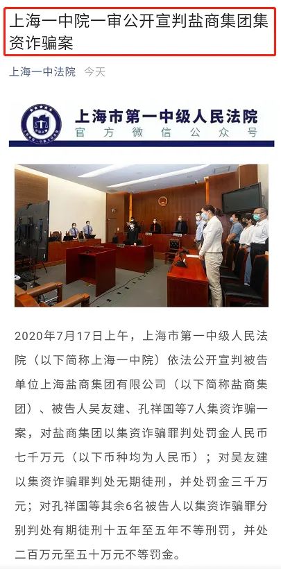 7月17日,上海市第一中级人民法院的官方微信“上海一中法院”发布消息称,当天上午,该院依法公开宣判被告单位上海盐商集团有限公司(以下简称盐商集团)、被告人吴友建、孔祥国等7人集资诈骗一案,其中盐商集团被判处罚金7000万元,吴友建被判处无期徒刑。