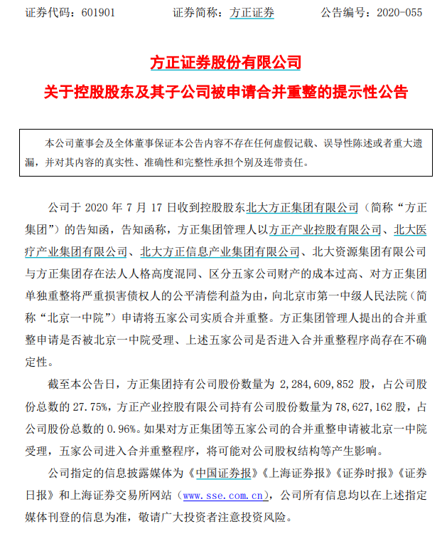 7月17日晚间,方正证券发布公告称,其控股股东及子公司被申请合并重整。方正集团管理人以方正集团及其旗下4家子公司存在法人人格高度混同、区分5家公司财产的成本过高、单独重整将严重损害债权人的公平清偿利益为由,向北京市一中院申请实质合并重整。