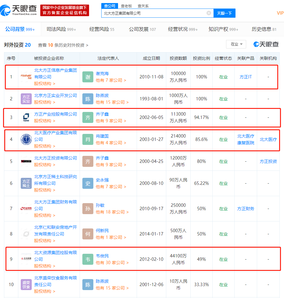 天眼查数据显示,4家公司的法定代表人中,谢克海为方正集团经理,肖建国为方正集团董事,且董事、监事名单中多有重合。不过,上述公司在业务和财产上是否存在混同,尚有待调查证实。
