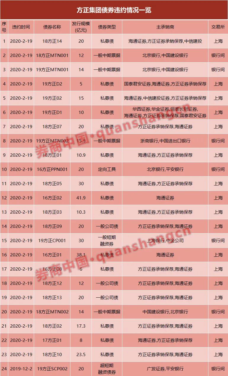 继2019年底出现债券违约后,今年上半年方正集团共有23只债券发生违约,成为2020年上半年最大的违约主体。值得一提的是,在方正集团发行债券的主承销商中,方正证券承销保荐(原民族证券)出现的频率颇高。