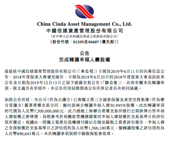 7月17日,中国信达在港交所公告称,上述转让交易于近日获得银保监会批复。自批准之日起,中国信达不再拥有幸福人寿任何股权。