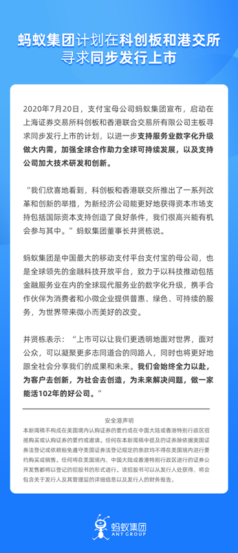 7月20日,支付宝母公司蚂蚁集团宣布,启动在上海证券交易所科创板和香港联合交易所有限公司主板寻求同步发行上市的计划,以进一步支持服务业数字化升级做大内需,加强全球合作助力全球可持续发展,以及支持公司加大技术研发和创新。