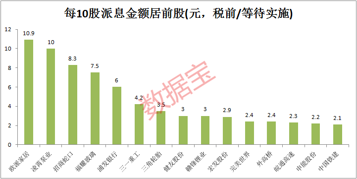 正值2019年报分红实施季,证券时报·数据宝统计显示,以2019年为基准,2019年有分配方案股共计2661只,创近10年新高。其中等待实施股还有70只,按照派息金额来看,每10股派息1元以上(含税)的有32家,派息金额居前三的为欧派家居、凌霄泵业及招商蛇口,分别为10.9元、10元及8.3元,其中前2股将于明日(7月21日)实施派息,欧派家居每10股转增4股。游戏股完美世界每10股转增5股,在这70股市转增比例较高。另外,健友股份及上海电影每10股分别转增3股、2股。