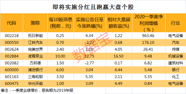 分红是提振股价的重要方式之一,数据宝统计显示,以上70股自发布分红实施方案以来上涨股、以及跑赢大盘个股占比均有六成,其中凌霄泵业、欧派家居及福耀玻璃均跑赢大盘10个百分点以上,同期大盘均为下跌,3股派息额均较高,但是一季度业绩均不佳,欧派家居一季度亏损1.02亿元,截至当前尚未发布中报(含预告),今年中报是否分红可能还要视情况而定。