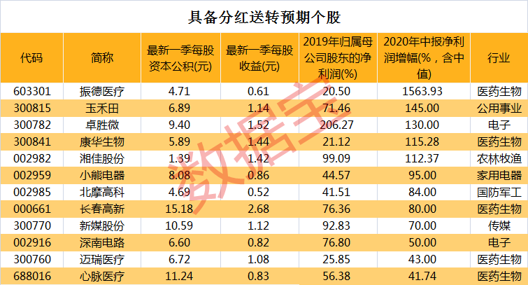 数据宝结合A股分红送转主要特征,对具有分红送转潜力的公司进行筛选。最新一季每股资本公积大于1元;2018、2019每股收益均超过1元,2020一季度每股收益超过0.5元;2019年净利润增幅超过20%,2020上半年(含预告中值)净利润增幅也超过20%。满足以上条件且尚未发布中报的股票共有12只,医药生物股多达5只。