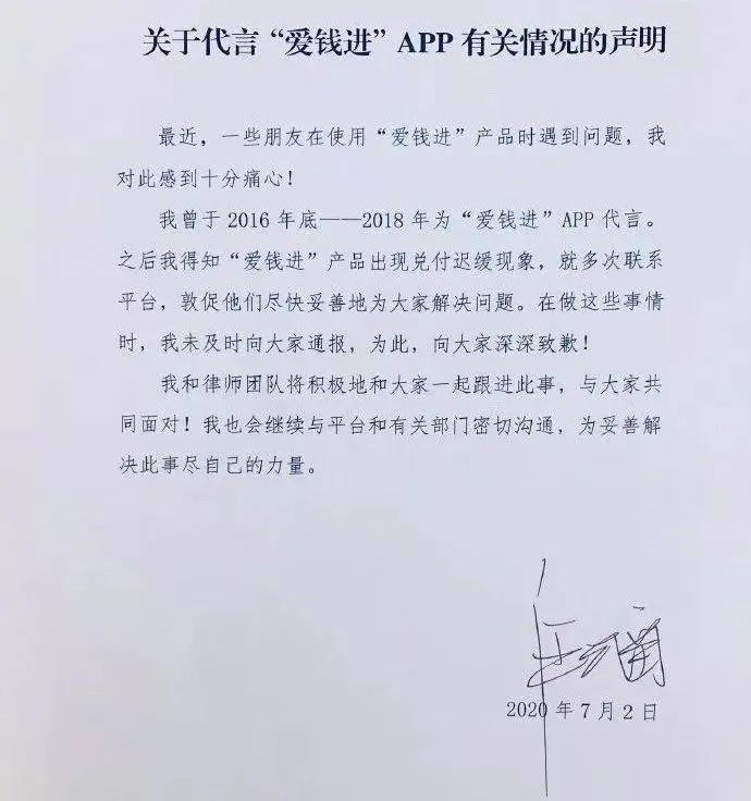 此外,国乒主教练刘国梁也在不久前因曾出任爱钱进幸福体验官而被线上讨债。对此,刘国梁在接受媒体采访时诚恳致歉,“对关注我的朋友们说声抱歉”。他还强调自己会和律师团队及工作室密切关注并跟进此事,尽最大限度地与平台、政府监管部门、司法部门积极沟通,和大家一起合法、合规地积极推动事态向好的方向发展。