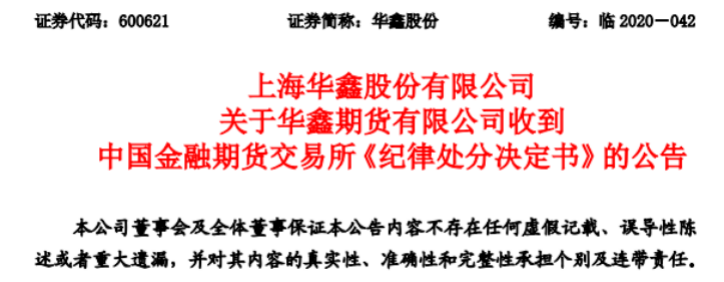 根据华鑫期货当晚公告,2020年7月17日,华鑫期货收到中国金融期货交易所《纪律处分决定书》([2020]1号),主要内容如下: