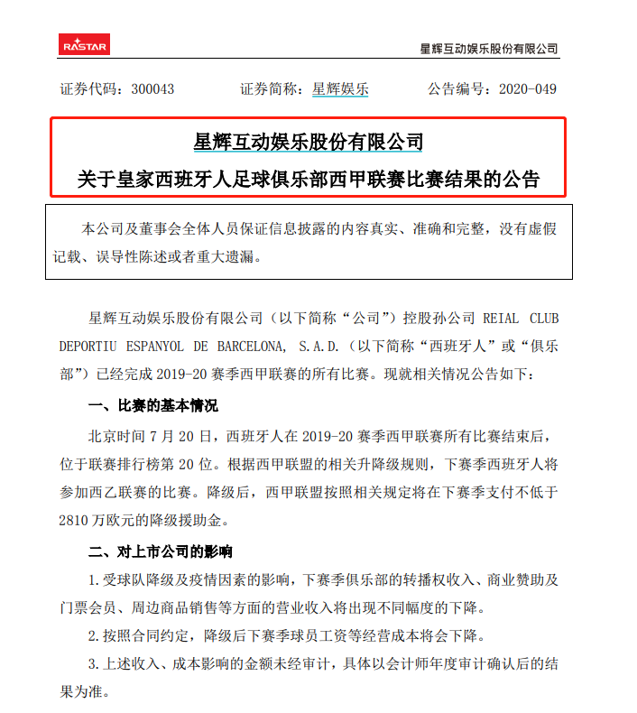 北京时间7月20日晚间,A股上市公司星辉互动娱乐股份有限公司(以下简称“星辉娱乐”)发布公告称,当天西班牙人在2019-20 赛季西甲联赛所有比赛结束后,位于联赛排行榜第 20 位。根据西甲联盟的相关升降级规则,下赛季西班牙人将参加西乙联赛的比赛。