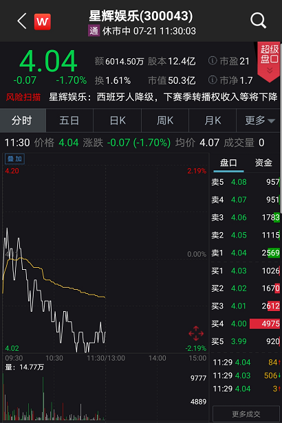 市场表现方面,截至7月21日上午收盘,星辉娱乐收于4.04元/股,下跌1.70%。