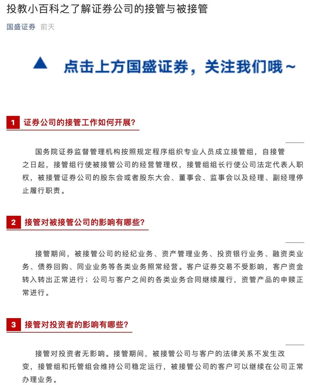 国盛证券在周末(19日)也推出投教百科,向投资者介绍证券公司被接管带来的实际影响,称“接管对投资者无影响。接管期间,被接管公司与客户的法律关系不发生改变,接管组和托管组会维持公司稳定运行,被接管公司的客户可以继续在公司正常办理业务。”
