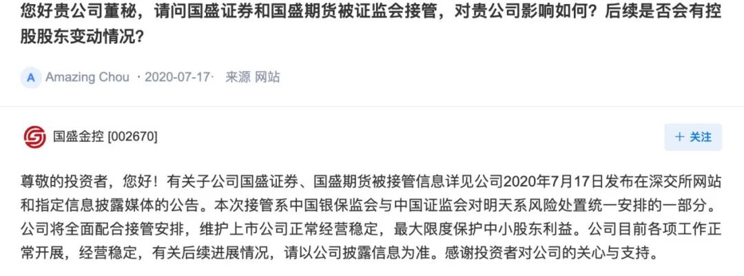 投资者对国盛证券股东变动也表示关注。国盛证券的股东国盛金控在投资者平台解答时表示,“公司将全面配合接管安排,维护上市公司正常经营稳定,最大限度保护中小股东利益。公司目前各项工作正常开展,经营稳定,有关后续进展情况,请以公司披露信息为准。”