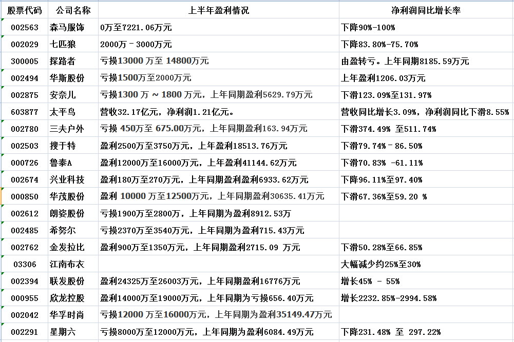 证券时报•e公司记者统计发现,截至7月21日,A股共有19家纺织服装类企业披露上半年业绩预告或业绩快报,其中17家业绩呈同比下滑态势,占比近九成,预计净利润下滑超过50%者15家。