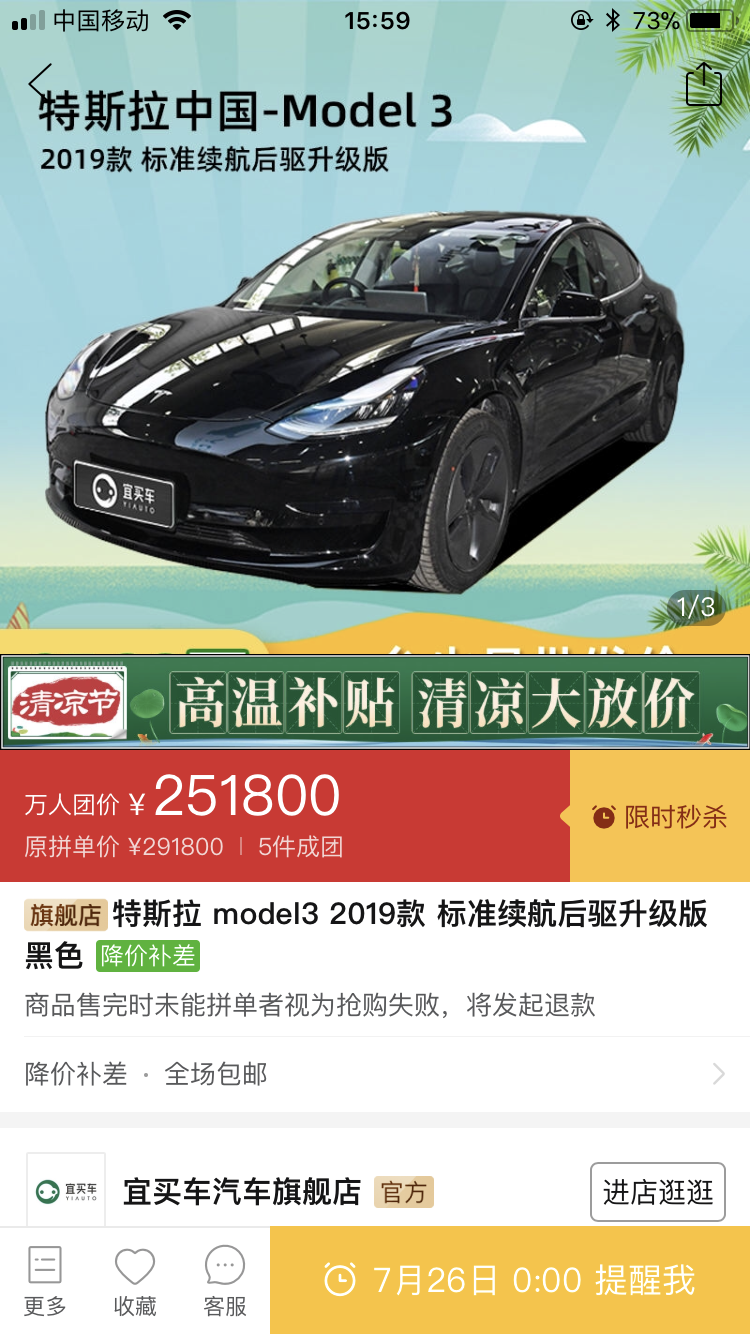 双方口水战缘起拼多多平台推出团购特拉斯Model3。在拼多多上的“宜买车汽车旗舰店”上,新上线了“特斯拉model3 2019款 标准续航后驱升级版黑色”产品,显示万人团购价251800元,该车官方指导价是291800元,拼多多上的价格直降4万,5件成团。该产品将在7月26日零点开抢。