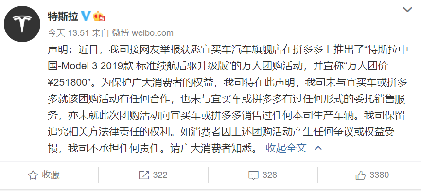 今日下午,特斯拉在官方微博上发布声明,称公司接网友举报获悉,宜买车汽车旗舰店,在拼多多上推出了,“特斯拉中国-Model 3 2019款标准续航后驱升级版”的万人团购活动,并宣称“万人团价251800”。