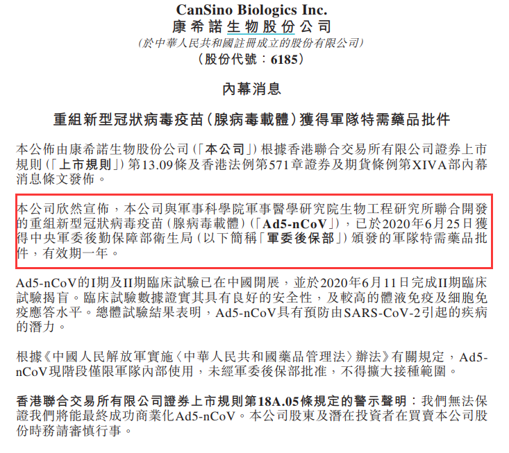 公告称,公司与军事科学院军事医学研究院生物工程研究所联合开发的重组新型冠状病毒疫苗(腺病毒载体)(Ad5-nCoV),已于2020年6月25日获得中央军委后勤保障部卫生局(下称“军委后保部”)颁发的军队特需药品批件,有效期一年。