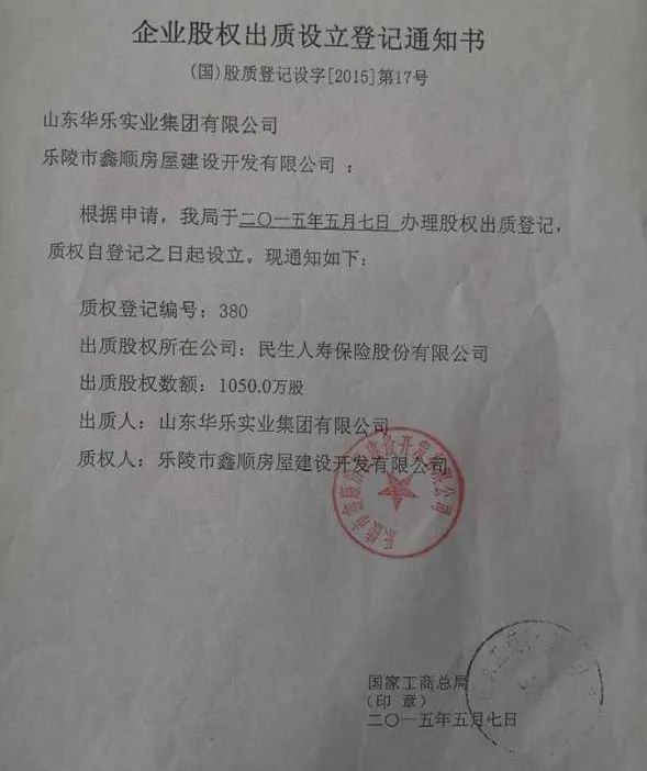 此次1050万股股权之所以被拍卖,与小股东山东华乐实业有关。2015年5月7日,山东华乐实业将所持1050万股民生人寿股权质押,质权人是乐陵市鑫顺房屋建设开发有限公司。