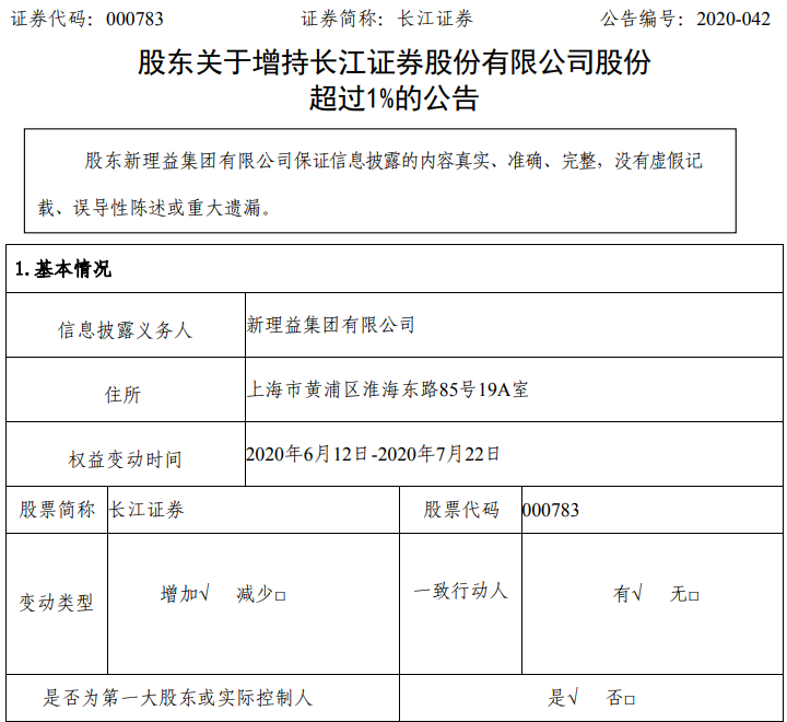 7月23日晚间,长江证券发布股东增持超过1%的公告。6月12日-7月22日,长江证券第一大股东新理益集团通过交易所集中交易的方式增持5563.28万股,增持比例1.01%,资金来源系自有资金。