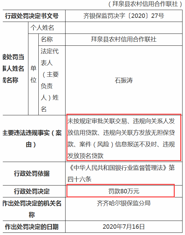其中一张罚单显示,拜泉县农村信用合作联社被罚款80万元。其主要违法违规事实为包括,未按规定审批关联交易,违规向关系人发放信用贷款,违规向关联方发放无担保贷款,案件(风险)信息报送不及时,违规发放顶名贷款。齐齐哈尔银保监分局作出处罚决定的日期为7月16日,即一个星期前。