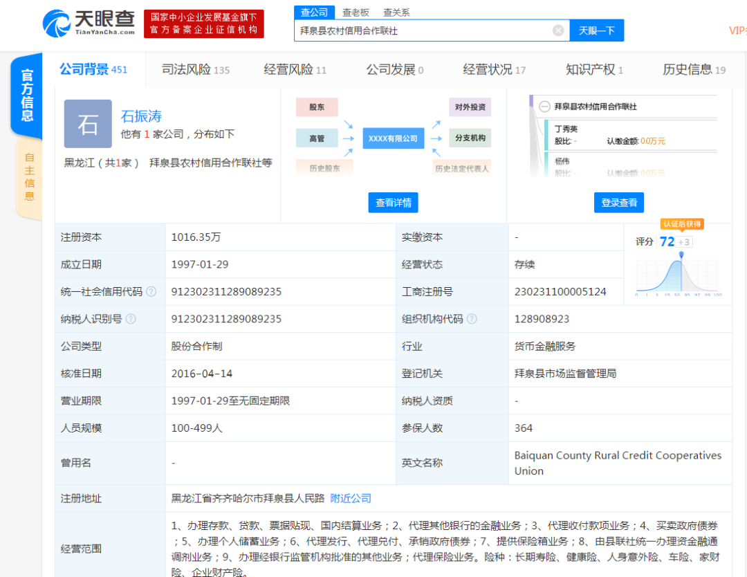 公开资料显示,拜泉县农村信用合作联社成立于1997年01月29日,注册地位于黑龙江省齐齐哈尔市拜泉县人民路,法定代表人为石振涛。