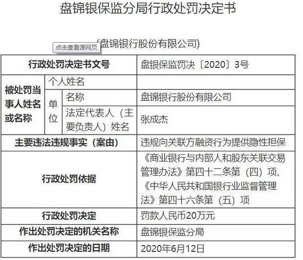今年6月,据银保监会公告,盘锦银行连收3张罚单,这是该行自2017年3月更名以来的首批罚单。其中一则处罚信息显示,盘锦银行违规向关联方融资行为提供隐性担保,被盘锦银保监分局罚款20万元。