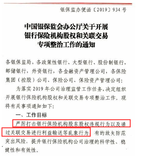 2019年7月,《中国银保监会办公厅关于开展银行保险机构股权和关联交易专项整治工作的通知》下发,其中就提到,要重点排查当前银行业机构是否存在以下几方面问题: