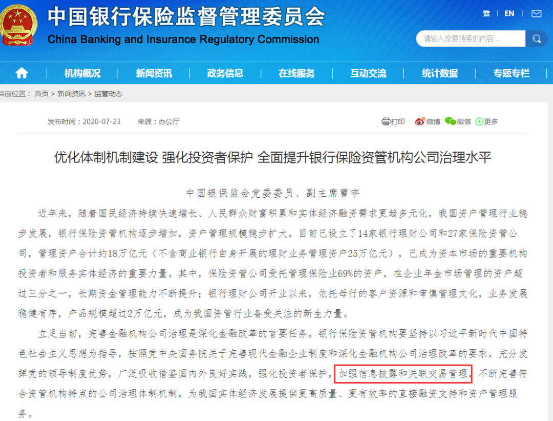 7月23日,银保监会发布《优化体制机制建设 强化投资者保护 全面提升银行保险资管机构公司治理水平》一文。