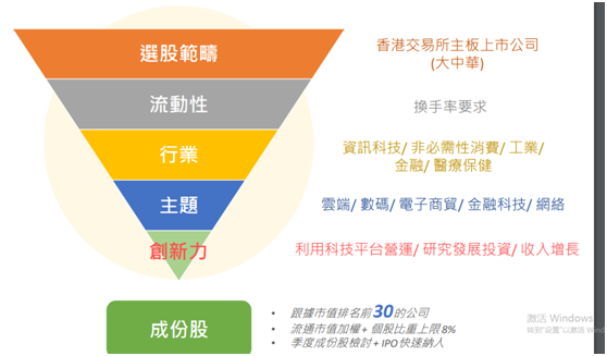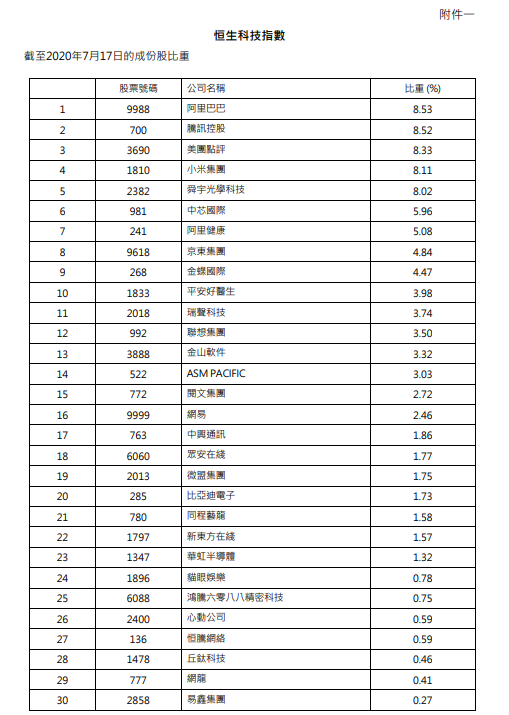 此次指数选股准则主要考虑合资格公司是否利用科技平台进行运营,研究开发占收入比例及收入增长。经此标准筛选后,纳入恒生科技指数的30只成分股如下: