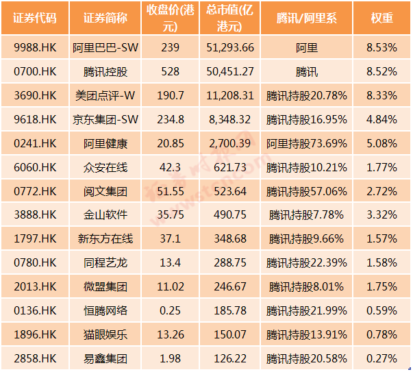值得一提的是,上述30只成分股中有12家为腾讯系,权重合计达到36.04%,阿里系有2家,权重合计13.61%。(注:众安在线同时也为阿里系企业)
