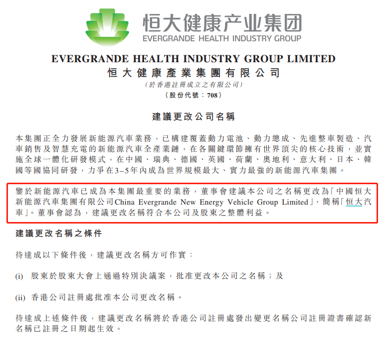 7月27日,恒大健康(00708.HK)公告称,鉴于新能源汽车已成为集团最重要的业务,董事会建议将公司名称更改为“中国恒大新能源汽车集团有限公司”,简称“恒大汽车”。
