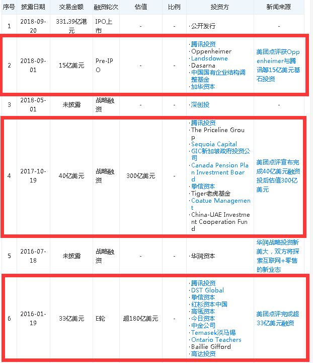 王兴曾透露,美团点评合并后,他希望美团点评能同时获得阿里、腾讯的支持。然而王兴却在阿里那里吃了闭门羹:阿里撤资,腾讯顺势追加10亿美元投资。 随后,腾讯投资在美团随后几轮融资都多次出现。