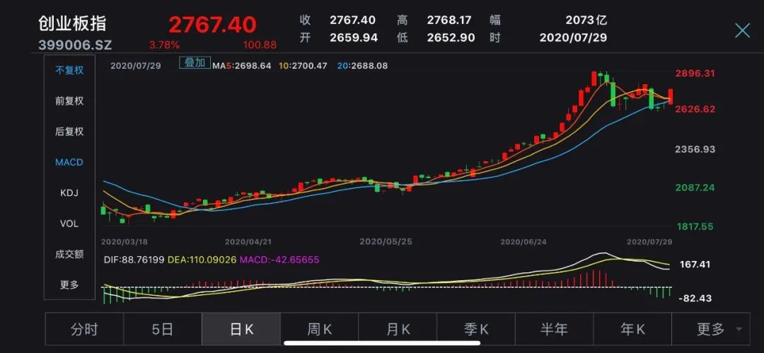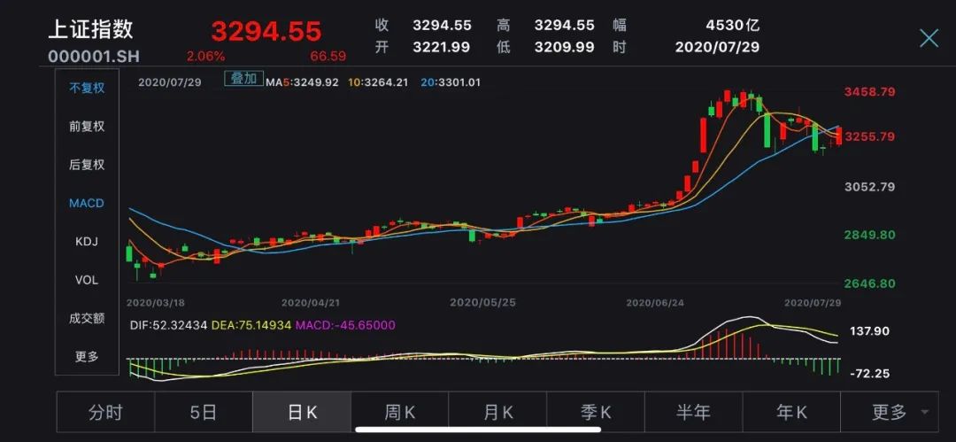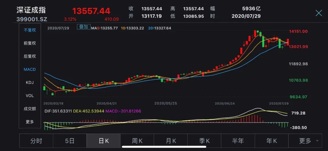 受中美摩擦升级影响,A股在经历上周五恐慌性的暴跌后,处于缩量震荡整理状态,今日终于放量大涨。7月29日,受隔夜美股尾盘跳水影响,A股三大指数早盘低开,之后在消费股的带动下,指数震荡高走,午后涨幅进一步拉大。上证指数上涨2.06%,收报3294.55点;深证成指上涨3.12%,收报13557.44点;创业板指大涨3.78%,收报2767.40点。