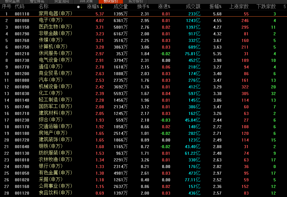 股市喜气洋洋,板块、个股收涨居多。沪深两市一共3583只股票上涨,涨停股137只。28个申万一级行业集体飘红,家用电器涨逾5%,电子涨逾4%,医药生物、非银金融、传媒、计算机板块涨逾3%,昨日领涨的食品饮料今日上涨0.69%。