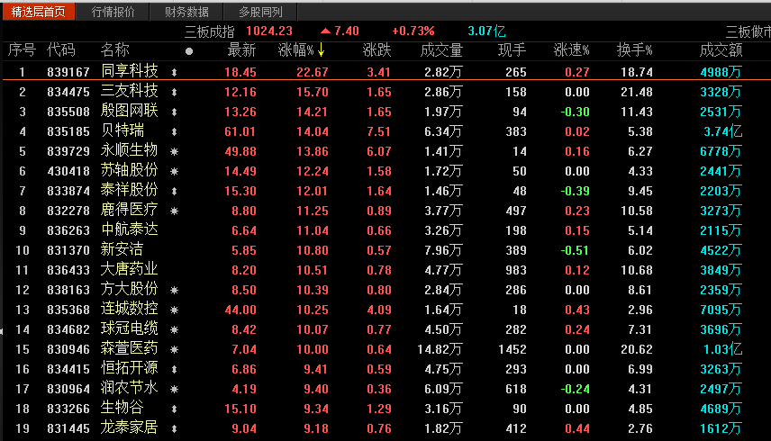 今日,32只新三板精选层股票大涨,最低涨幅为5.12%,涨幅超过9%的有20只股票。同享科技以22.67%的涨幅居首,三友科技涨近16%,殷图网联、贝特瑞、永顺生物涨幅超13%。三板成指微涨0.73%,收于1024.23点;三板做市指数上涨1.56%,收于1122点。