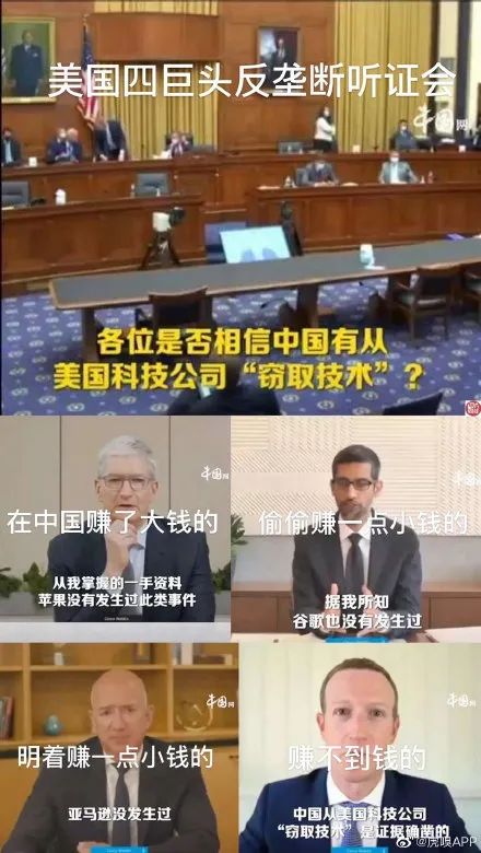 美国东部时间7月28日,美国国会举行了“反垄断”听证会,在听证会中,被问及“是否认为中国政府窃取美国技术”时,苹果CEO库克的回答是,“从我掌握的第一手资料看,苹果公司没有发生过此类事件”;谷歌CEO皮查伊的回答是“据我所知,谷歌也没有发生过”;亚马逊CEO贝索斯的回答讨巧一些,称“只是从报道上听说过‘窃取技术’,亚马逊没发生过”;Facebook CEO扎克伯格的回答则让外界大跌眼镜——“中国从美国科技公司‘窃取技术’是证据确凿的”。中国网民对四人问答进行了神总结:从中国赚大钱的(苹果),赚了小钱的(亚马逊),悄悄赚了小钱的(谷歌)都说“没有”,“没听说”,“不知道”,唯独在中国市场理论上完全没赚钱的(脸谱)说“有”。