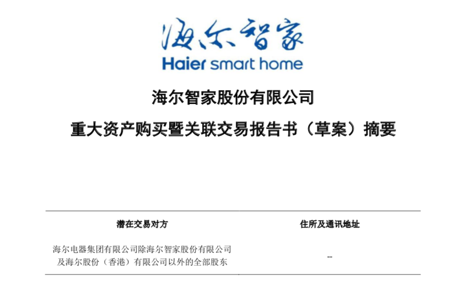 据悉,当日海尔智家(600690.SH)和海尔电器(1169.HK)联合发布公告宣布,海尔智家拟重大资产重组,私有化在香港联交所上市的海尔电器。