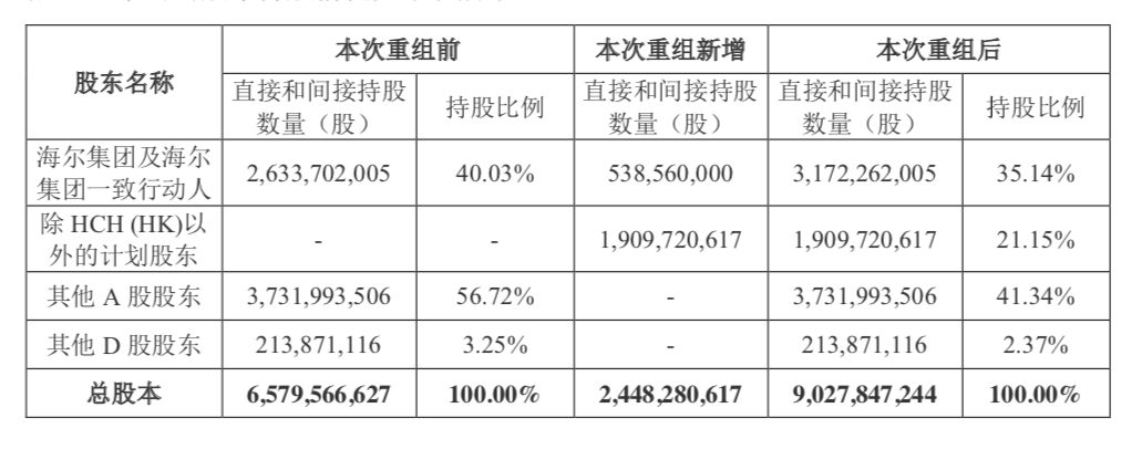 对于股东结构,公告中显示,截至重组报告书出具之日,上市公司总股本为65.8亿股。如可交换债券持有人在计划登记日前全部不行使换股权,本次交易完成后,上市公司总股本为90.28亿股,海尔集团及海尔集团一致行动人合计持有和控制31.72亿股,占上市公司本次交易后总股本的35.14%,除HCH(HK)以外的计划股东将持有19.1亿股,占上市公司本次交易后总股本的21.15%,