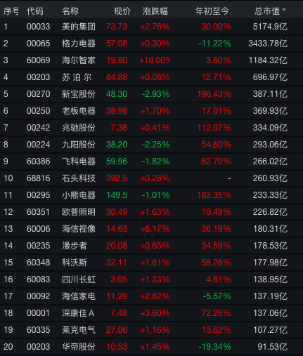 在家电行业中,无论是从营收还是从市值来看,美的集团当之无愧为家电行业的龙头老大。截至发稿,美的最新总市值达5174.9亿元,而格力电器紧随其后为3443.78亿元,海尔智家目前排名第三总市值为1185.32亿元。