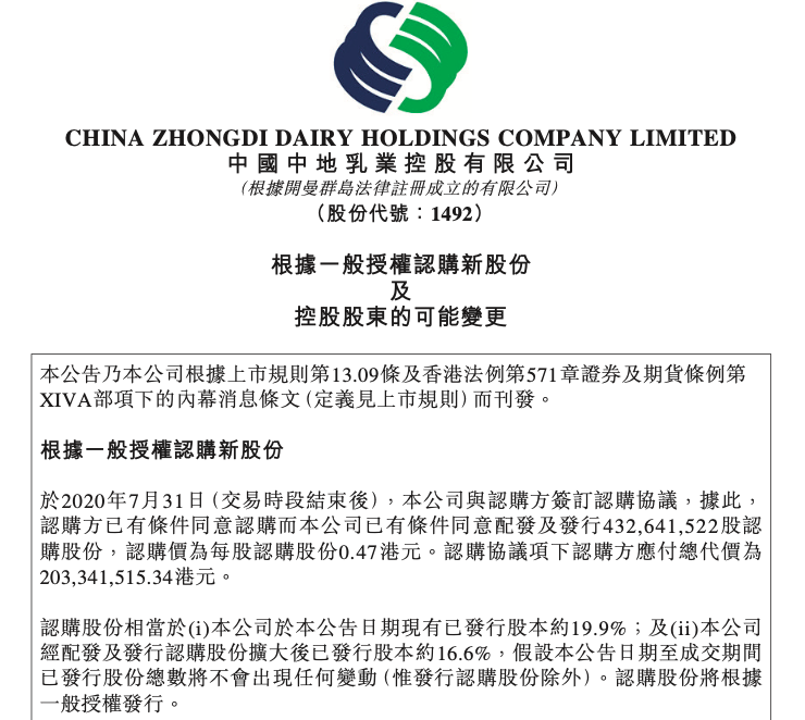 7月31日,中地乳业发布公告称,公司拟向认购方香港金港商贸控股(由伊利股份全资拥有)配售4.33亿股新股,占经扩大后公司股份约16.6%,每股发行价为0.47港元,较7月31日收市价0.58港元折让约18.97%。认购完成后,金港控股将位列后者第二大股东。