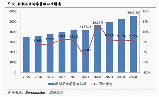 数据显示,2015-2019年我国乳制品市场年均复合增速为4.56%,2019年乳制品市场零售总额突破4000亿元。根据机构预测,未来五年我国乳制品市场仍将稳步发展,至2024年乳制品市场零售额或将突破5500亿元。