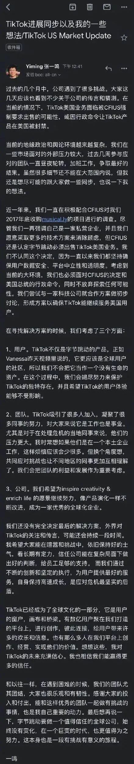 8月3日中午,字节跳动创始人张一鸣发送公司全员信,回应了TikTok美国业务面临被CFIUS(美国外资投资委员会)强制要求出售的问题。全员信回溯了近一年来TikTok在北美的遭遇,坦承还没有完全决定最后的解决方案。