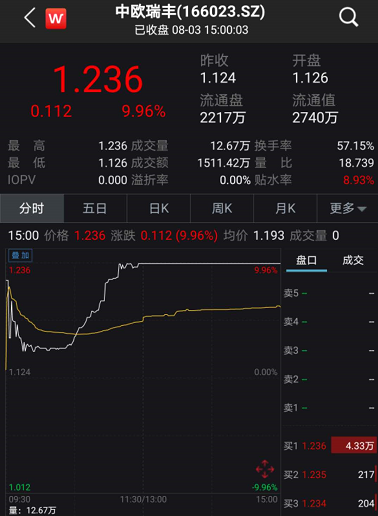 令人惊讶的是,8月3日,二级市场中欧瑞丰涨停了。此前,中欧基金发布公告,旗下基金中欧瑞丰自8月1日起将转型为上市开放式基金(LOF),也就是说投资者可以在市场上交易这只基金。截至收盘,中欧瑞丰涨幅达9.96%,报收1.236元。