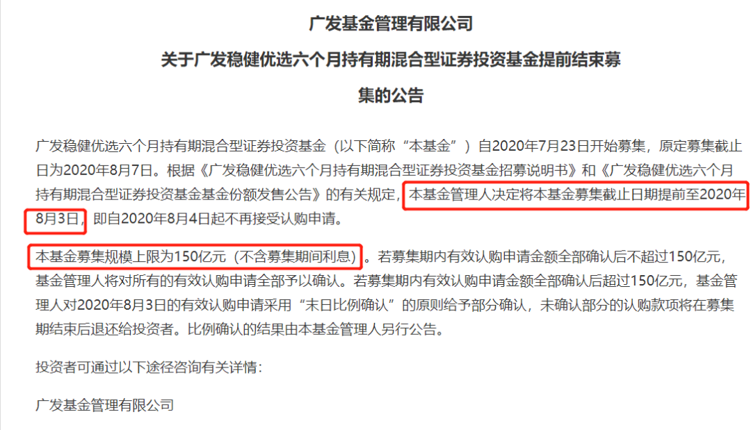 广发基金也出现了爆款产品。广发基金8月3日公告称,广发稳健优选六个月持有期混合型基金自7月23日开始募集,原定募集截止日为8月7日,该公司决定将基金募集截止日期提前至8月3日,即自2020年8月4日起不再接受认购申请。