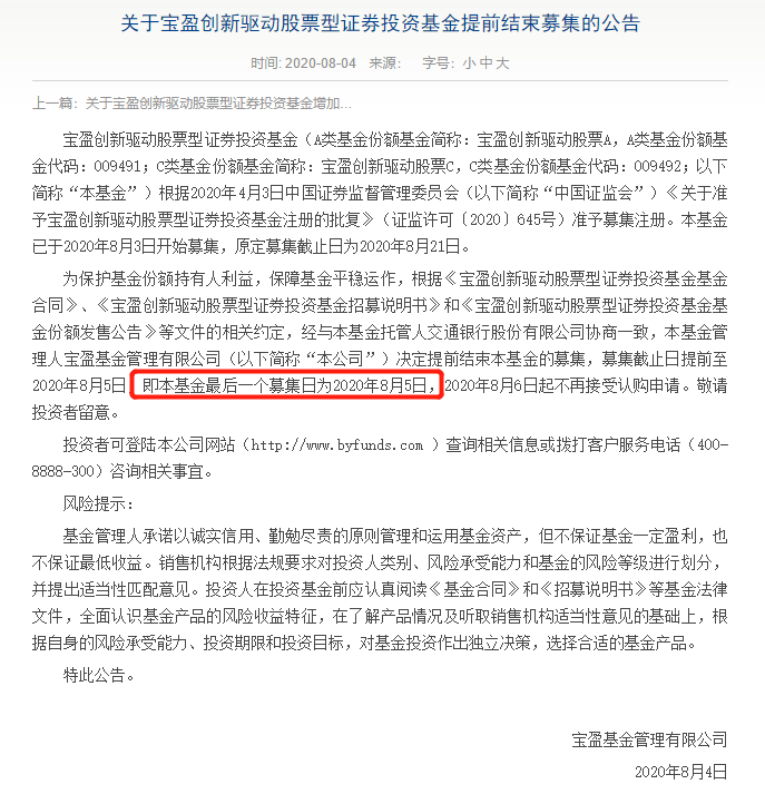 此外,8月3日进入首发的宝盈创新驱动股票基金也提前结束募集。宝盈基金发布公告称,该基金于2020年8月3日开始募集,原定募集截止日为2020年8月21日。宝盈基金决定提前结束本基金的募集,募集截止日提前至2020年8月5日,2020年8月6日起不再接受认购申请。