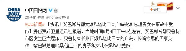 最新消息显示,当地时间8月4日下午6点左右,黎巴嫩首都贝鲁特市区发生巨大爆炸。贝鲁特省长形容爆炸堪比日本的广岛、长崎核爆的国家灾难。黎巴嫩总理哈桑·迪亚卜的妻子和女儿在爆炸中受伤。黎巴嫩卫生部长表示,贝鲁特的爆炸造成30多人死亡、3000多人受伤,目前伤亡人数还在不断上升。黎巴嫩高级安全官员表示,爆炸是由大约2700吨硝酸铵引起的。
