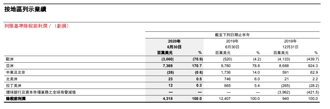若以地区列示业绩划分,按列账基准计算,今年上半年欧洲、中东及北非两个地区均“亏损”,分别录得税前亏损30.6亿美元及2600万美元,期内几乎由亚洲业务贡献独撑整个集团利润,单计亚洲业务税前赚73.69亿美元,是税前净利润的1.7倍,完全覆盖欧洲、中东及北非的亏损。